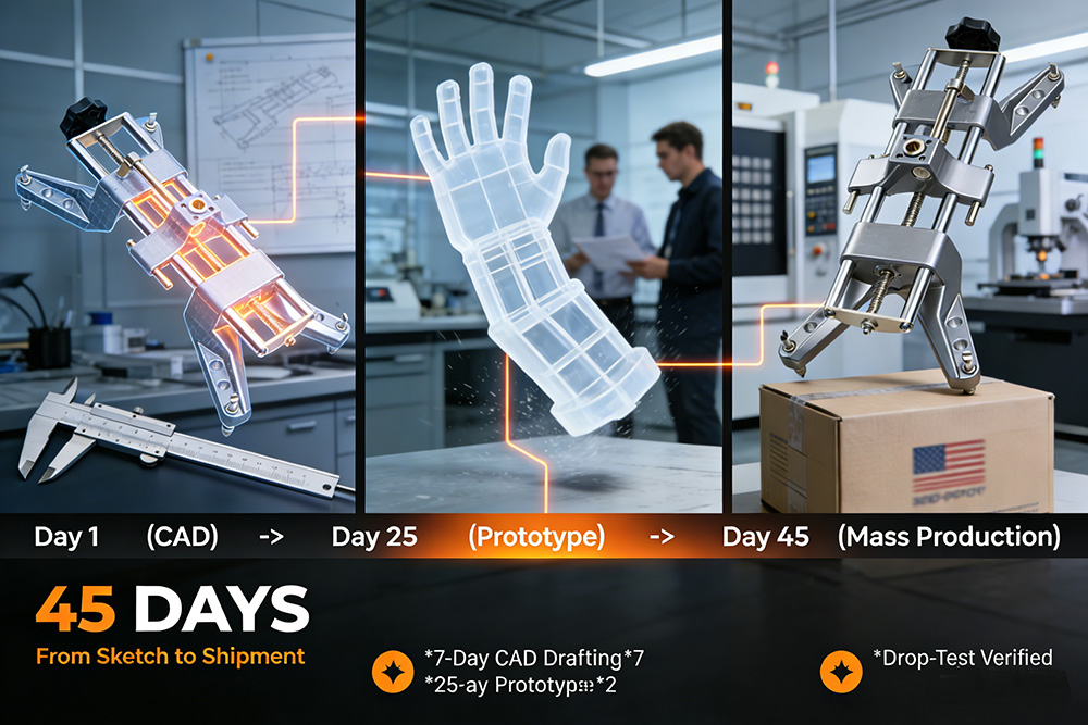 Мы немедленно мобилизовали нашу команду исследований и разработок для настройки зажимов для установки колес OEM и ODM. Всего за 7 дней наши инженеры создали точные чертежи САПР, воплотив свое видение в цифровой чертеж. Понимая, что физическая проверка имеет решающее значение для продукта, который будет подвергаться ежедневным нагрузкам в загруженной мастерской, мы перешли к быстрому прототипированию. К 25-му дню у нас в руках была функциональная модель руки, распечатанная на 3D-принтере.